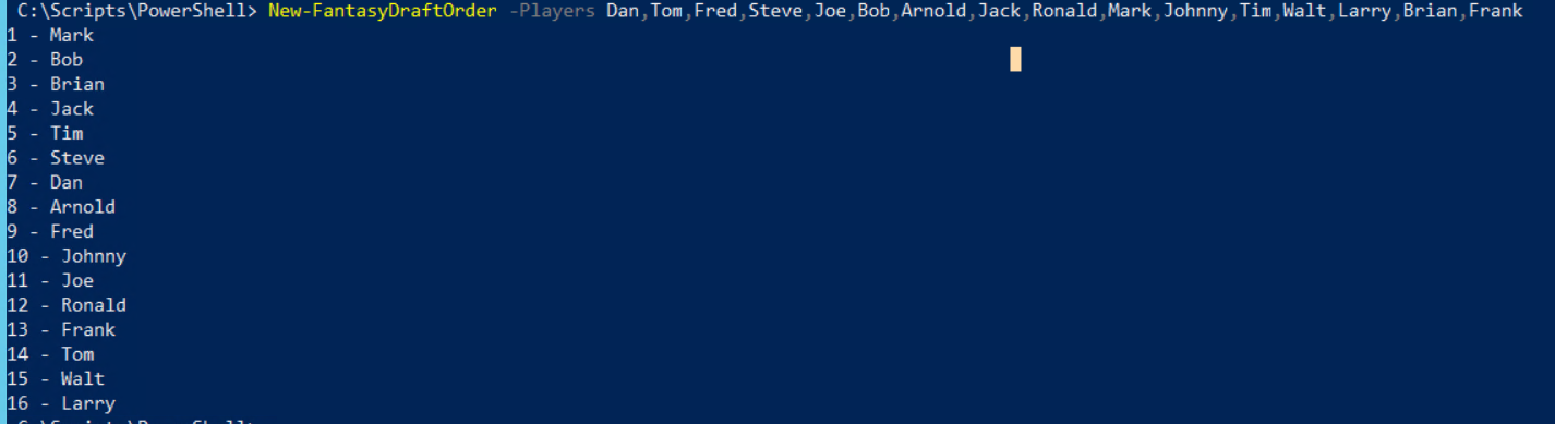 With this said, I emailed the commissioner of my league to let him know I will be doing the order in PowerShell, this way when I wind up inevitably missing the playoffs, I can only blame myself and PowerShell. I created a function this morning that will generate the order using the players in an array and Sort-Object {Get-Random} called New-FantasyDraftOrder.